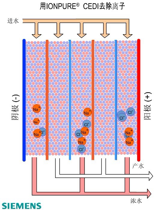 EDI過(guò)程一般城市水源中存在鈉、鈣、鎂、氯化物、硝酸鹽、碳酸氫鹽等溶解物。這些化合物由帶負(fù)電荷的陰離子和帶正電荷的陽(yáng)離子組成。通過(guò)反滲透預(yù)處理,99%以上的離子可以被除去。另外,原水中也可能包括其他微量元素、溶解的氣體(例如CO2)和一些弱電解質(zhì)(例如硼,二氧化硅)這些雜質(zhì)在工業(yè)除鹽水中必須被除掉。但是反滲透過(guò)程對(duì)于這些雜質(zhì)的清除效果較差。